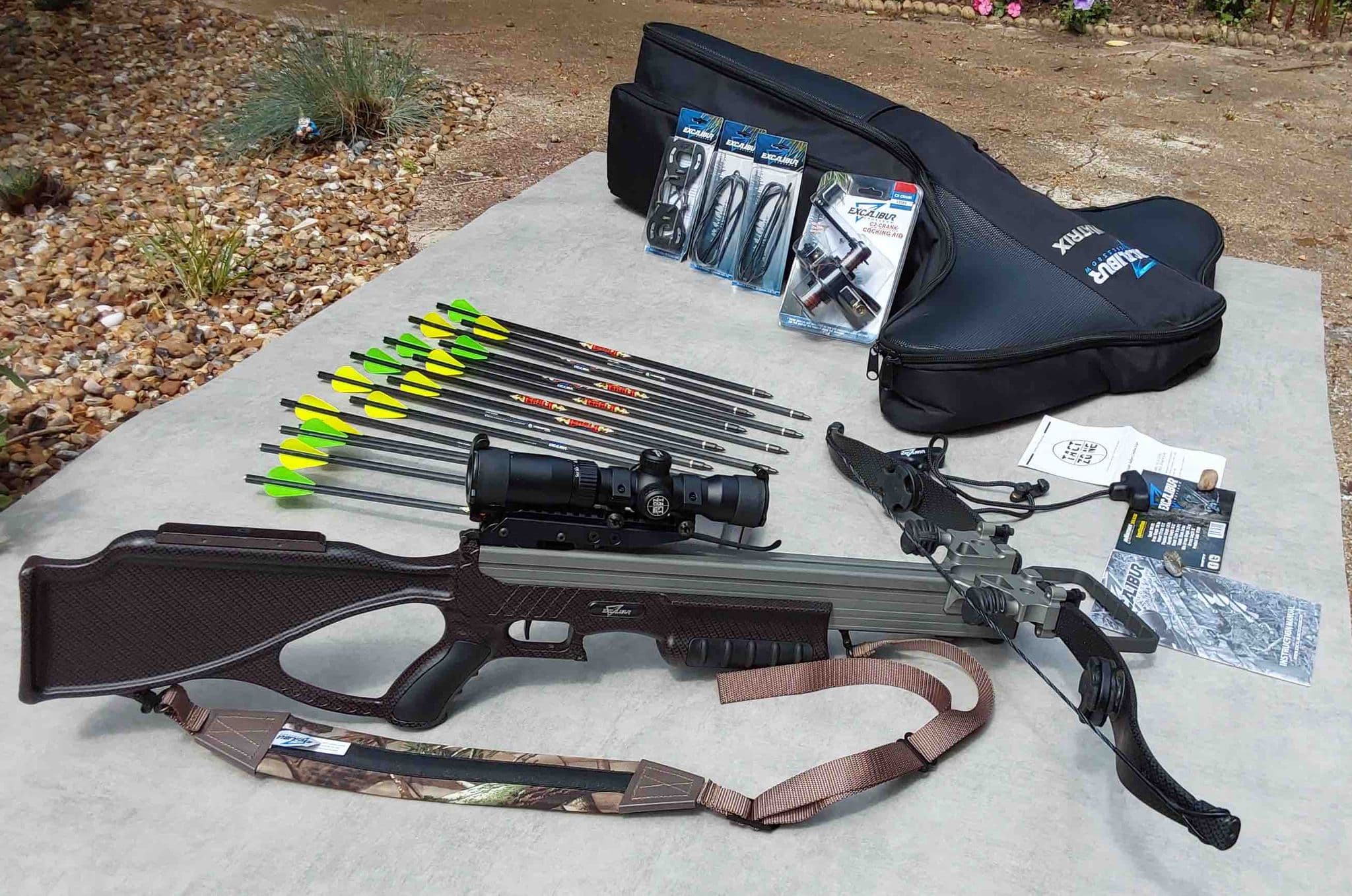 Description: As new condition, only shot 2 bolts. With Matrix Tombstone case. 15 x 18" Diablo carbon bolts, 150 grain heads. 2 new Excalibur strings. 1 new Excalibur stringer. 1 Excalibur cooking rope. 1 new Excalibur C2 crank cocking aid. Excalibur shoulder sling. .