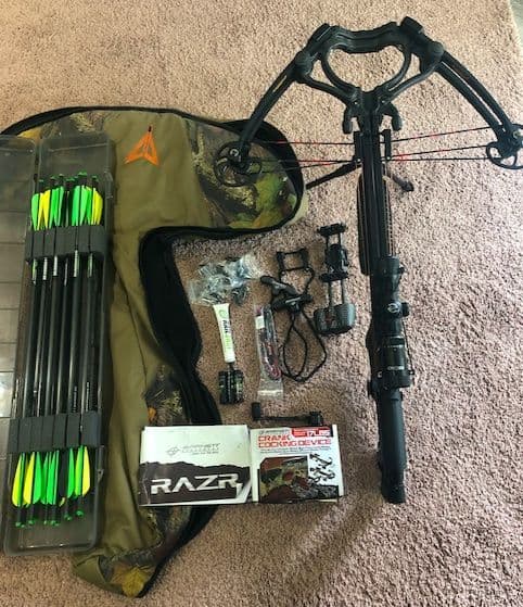 Description: Barnett Razr, Fitted with cranking device, Carrying / storage case, Bipod, Arrow case with 22 arrows with various tips, spare string,