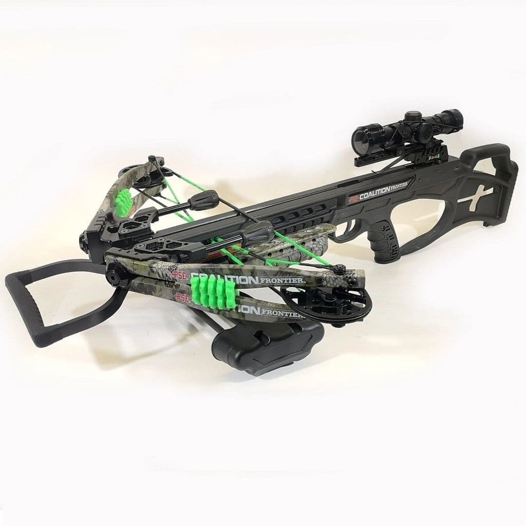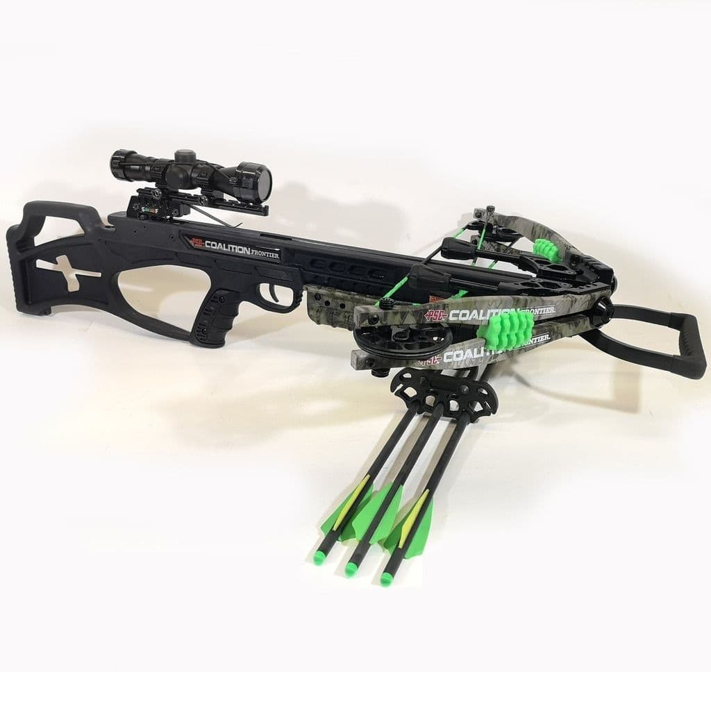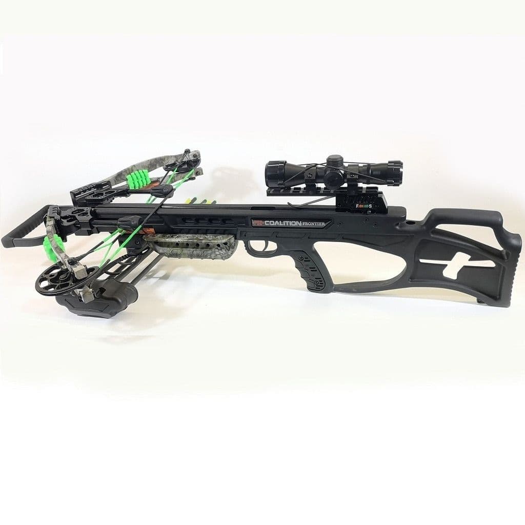 Join the crossbow revolution with COALITION® FRONTIER. Delivering 380 fps, the COALITION® FRONTIER is a fast and compact affordable crossbow with an adjustable stock, illuminated reticle scope, quiver, bolts and, cocking rope.