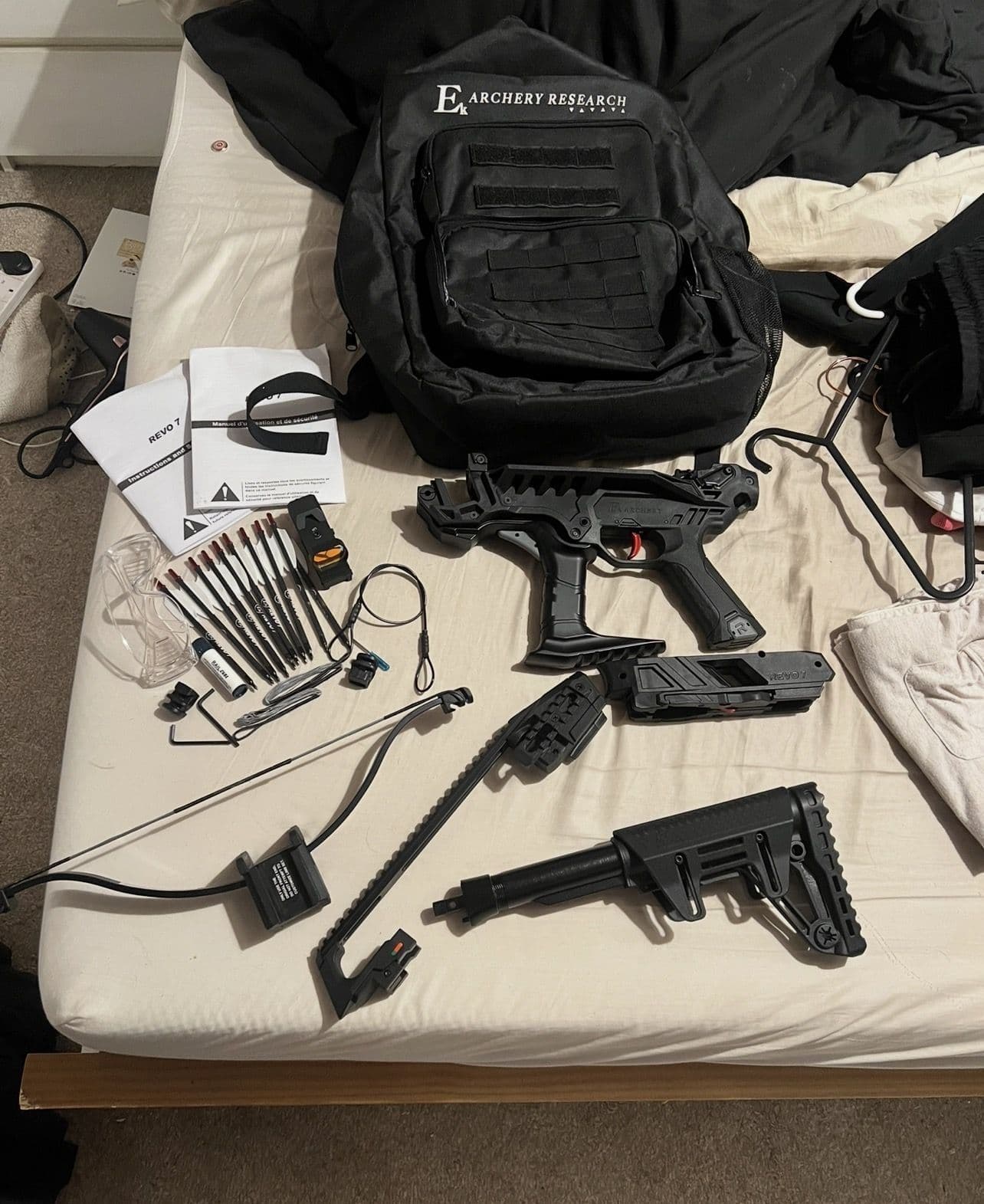 Description: Used twice have no longer got the land to be able to shoot it comes with 10 bolts and all original parts straight out the box also comes with a revo 7 bag perfect for safe storage of the crossbow